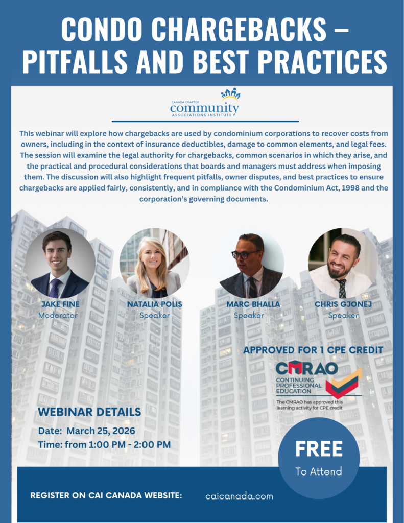 This webinar will explore how chargebacks are used by condominium corporations to recover costs from owners, including in the context of insurance deductibles, damage to common elements, and legal fees. The session will examine the legal authority for chargebacks, common scenarios in which they arise, and the practical and procedural considerations that boards and managers must address when imposing them. The discussion will also highlight frequent pitfalls, owner disputes, and best practices to ensure chargebacks are applied fairly, consistently, and in compliance with the Condominium Act, 1998 and the corporation’s governing documents.