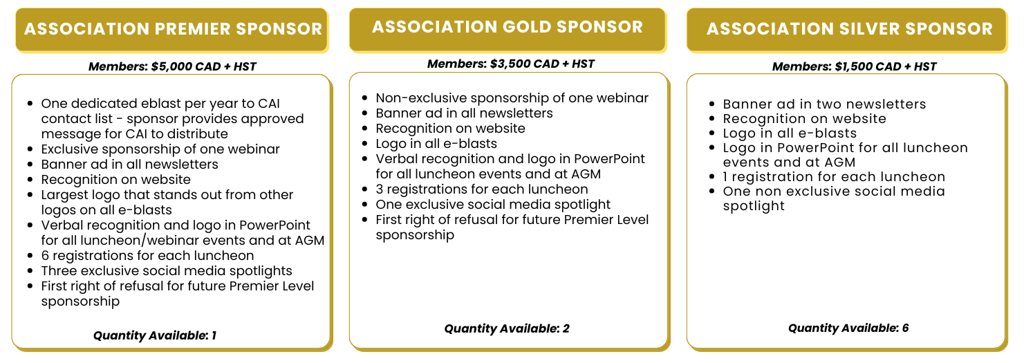 If you are seeking an opportunity to support CAI Canada and gain ongoing exposure throughout the year, then the following sponsorship packages may be just what you are looking for!